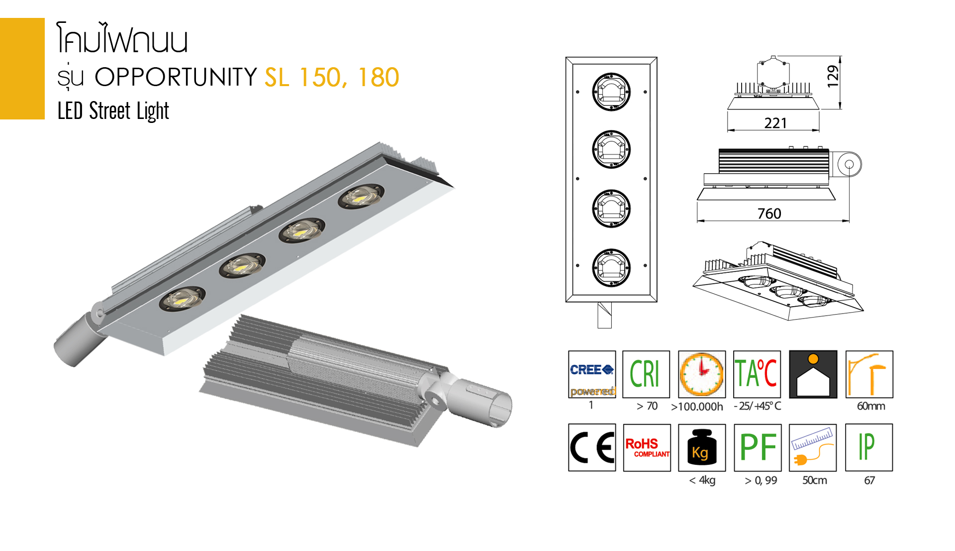 OPPORTUNITY SL150, 180 ออกแบบเพื่อใช้ทดแทนโคมไฟถนนแบบเก่า หลอด HIGH PRESSURE SODIUM ขนาด 450W จุดเด่นของโคม OPPORTUNITY SL150, 180 มีดังนี้